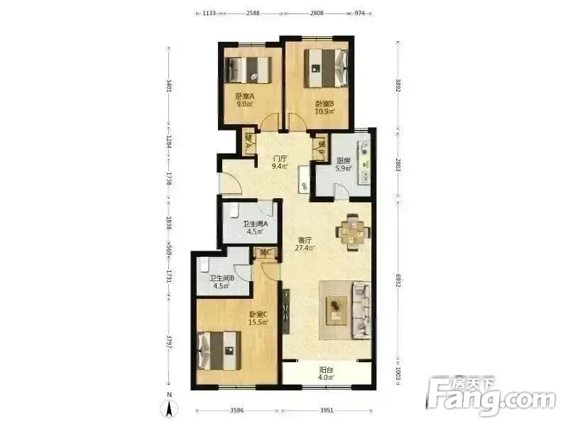 【1】:房本面积为128.15平米,主体南北向3居,明厨+明卫,属于整个小区都极的全明格局户型。