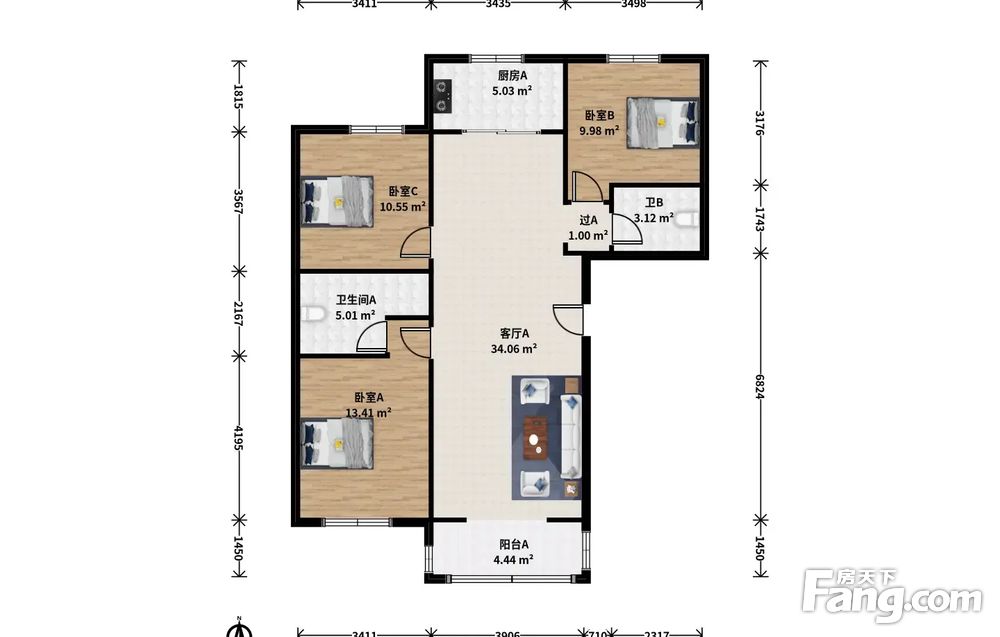 此房户型为3室1厅1卫,建筑面积为112.07平米,主卧带卫生间,南向客厅落地阳台,主卧南向