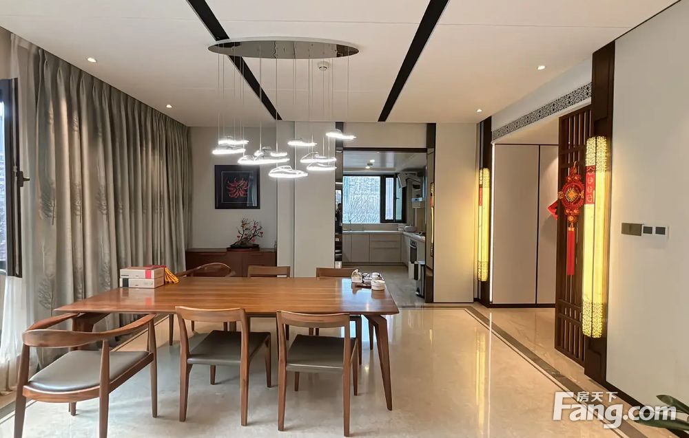 ①装修风格:开发商原始精装修,新中式风格,梁景华先生设计,沉稳大气。以框线及对称格局把现代中式发挥得酣畅淋漓,采用细腻的金属框线,透过框线让空|间更具层次、灵气和张力,让居者时刻感受到空|间的静态美。 ②品牌介绍:厨房配备博士(bosch)抽油烟机,灶台,橱柜和水槽等厨具;卫生间配备瑞士劳芬品牌洗盆、浴盆等卫具;门锁采用三星智能锁。玉石灯,卧室铺的黑色木地板,客厅,玄关都是大理石材地面