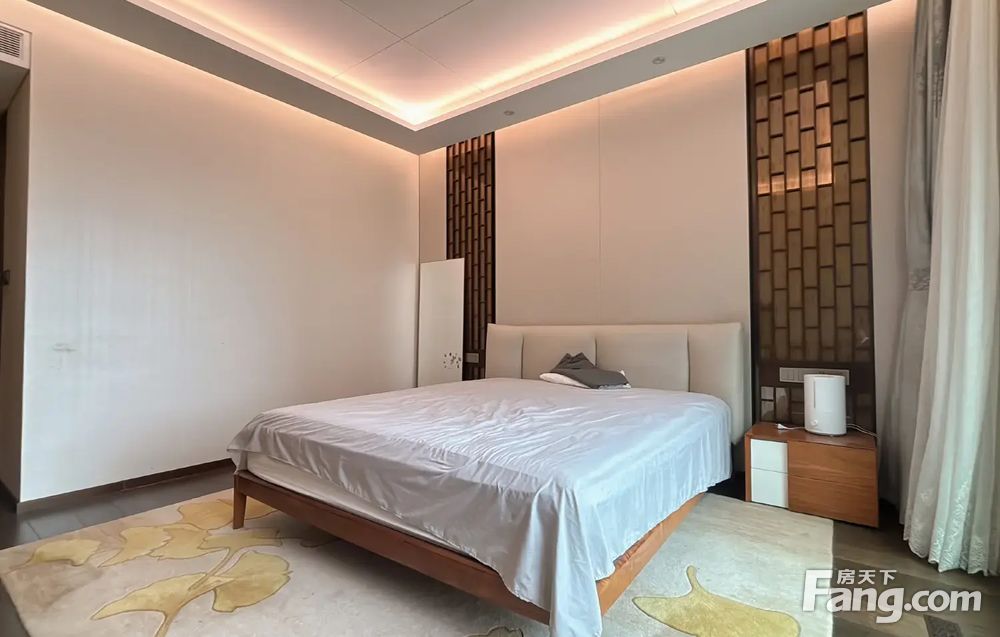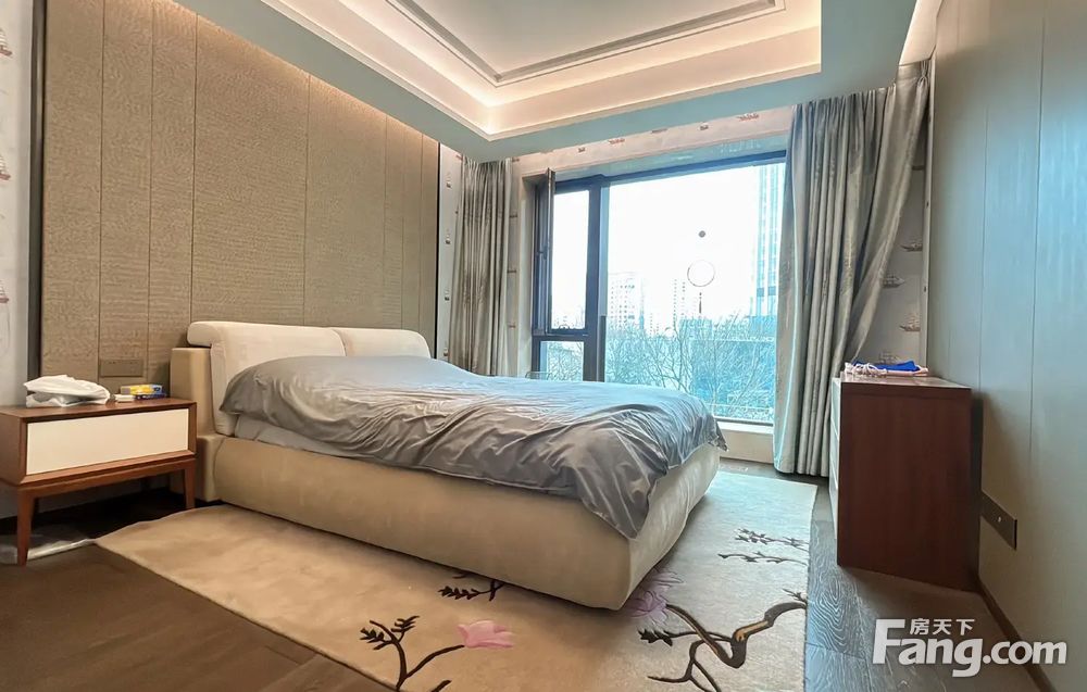 4室2厅3卫:南北通透,把边户型三面采光,客厅双面采光 ①南向双主卧套房,互不打扰,南偏东40度,通体大落地窗采光好时间长 ②北向两个次卧室,西北朝向,下午会有阳光进入房间 ③客厅是一个L形边厅,两面采光,客厅大面宽8.7米大落地窗,采光好时间长