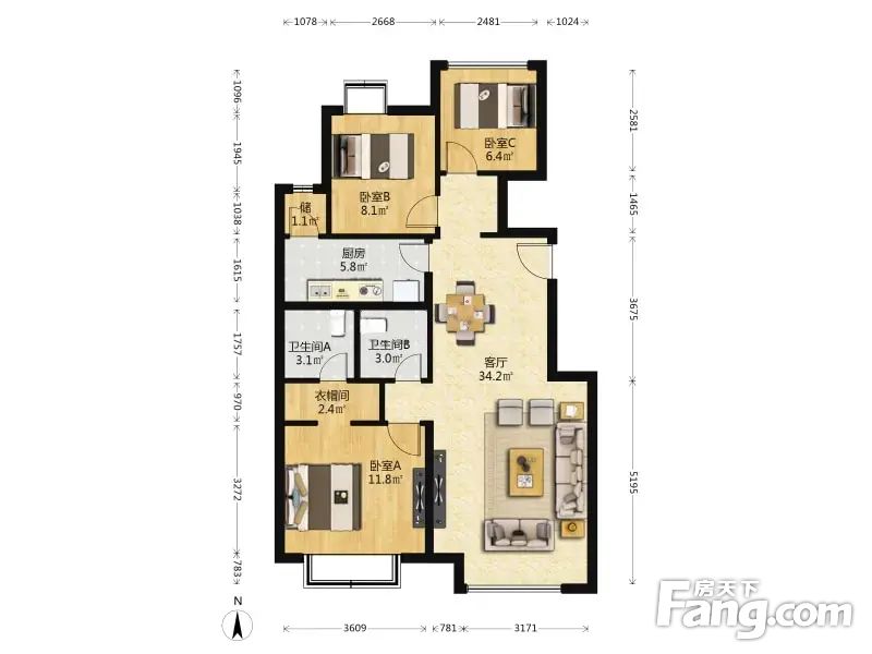 【一】富力华庭苑100.36㎡精装3房2卫 南北通透 空间敞亮 使用率高