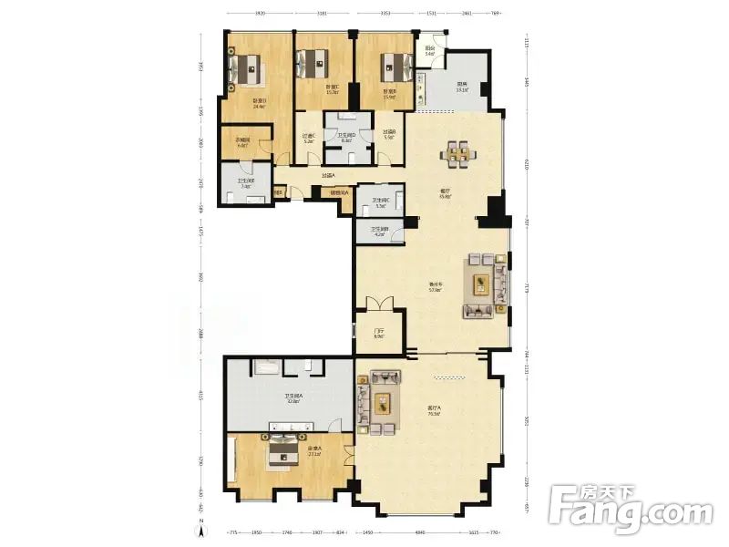户型介绍此房为南北通透的四居室,每个房间都有卫生间,厨房也是中西式分开的,主客厅,活动厅,餐厅,电梯入户,平层住宅,一家人带老人居住都十分宽敞